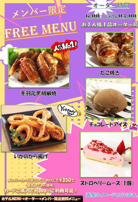 - メンバー限定の無料フードが新しくなりました。詳しくはこちら